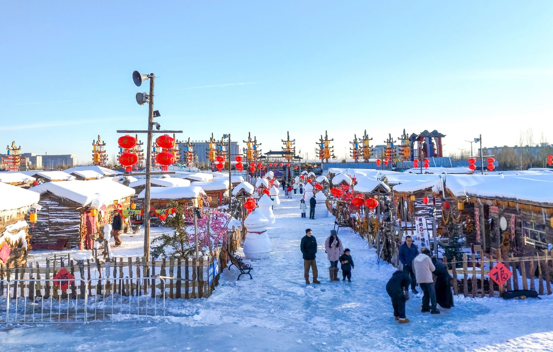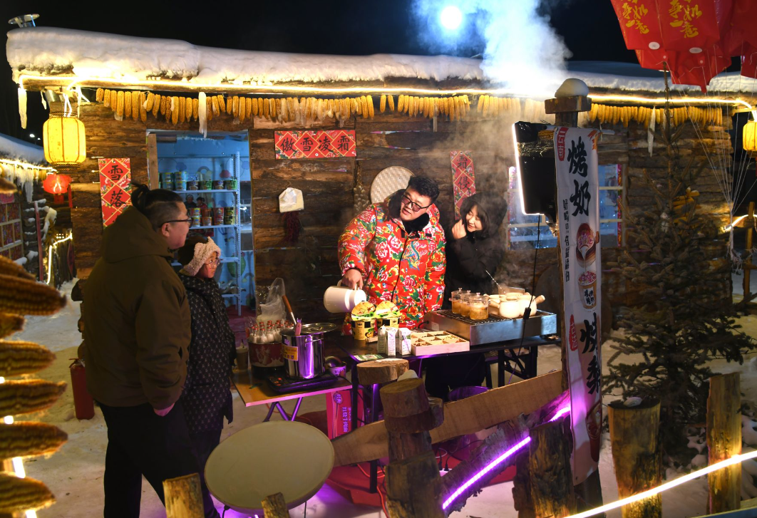 踏入雪鄉(xiāng)板塊,50個(gè)復(fù)刻北方傳統(tǒng)風(fēng)貌的院落集群映入眼簾,木柵欄上垂掛的紅燈籠與蓬松雪層相映成趣,屋檐下懸垂的雪舌、雪簾勾勒出童話般的輪廓。每個(gè)院落都藏著專屬打卡場(chǎng)景,推門而入可見家庭場(chǎng)景,窗外是皚皚白雪,屋內(nèi)飄著燒烤、火鍋和奶茶的醇厚香氣,瞬間驅(qū)散冬日寒意。游客穿梭其間,鈴鐺輕響,為這份雪鄉(xiāng)煙火氣增添了濃郁的民族風(fēng)情。