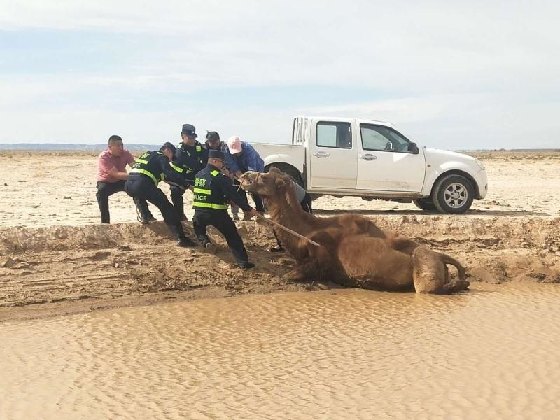 無(wú)獨(dú)有偶。當(dāng)日下午,阿拉善左旗蘇宏圖邊境派出所也接到群眾報(bào)警:稱(chēng)其一峰駱駝陷入泥潭無(wú)法脫身,請(qǐng)求救助。民警趕到現(xiàn)場(chǎng)后發(fā)現(xiàn)這是一峰懷孕母駝,在飲水時(shí)不慎滑入泥潭,由于浸泡許久,已經(jīng)無(wú)法站立。民警當(dāng)即采取措施,在避免肚子受傷害的前提下,將兩條繩子分別固定在駱駝前肢與后肢,再利用人力拖拽,經(jīng)過(guò)2個(gè)小時(shí)的救援,成功將母駝救出。(牛鑫 梁鎮(zhèn) 于鶴偉)