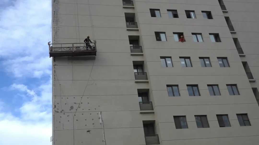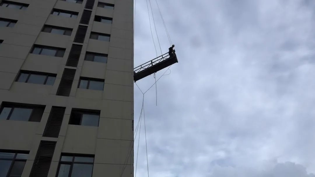 17時(shí)16分,包頭市消防救援支隊(duì)健康路消防站接到指揮中心派警后,立即出動(dòng)2輛消防車、10名消防隊(duì)員火速趕到現(xiàn)場(chǎng)。消防隊(duì)員觀察發(fā)現(xiàn),一名負(fù)責(zé)粉刷大樓外墻的工人被困在公寓外7-8樓之間吊籃中,大顆大顆的冰雹打在他身上,升降機(jī)器鋼絲繩在風(fēng)雨中被纏繞在一起,吊籃無法升降。由于天氣惡劣,風(fēng)速很大,情況十分危險(xiǎn)。