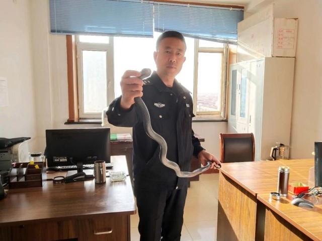 隨后,民警將這條蛇裝入塑料袋,并將其層層包裹,放入警車的后備箱內(nèi)。然而,不可思議的事情發(fā)生了。11月6日,當(dāng)民警打開警車,準(zhǔn)備將其送往呼和浩特市野生動(dòng)物園時(shí),發(fā)現(xiàn)這條蛇“逃逸”了,包裹其的塑料袋已被咬破。民警在警車內(nèi)四處尋找,卻未能找到它的蹤影。直到11月7日中午時(shí)分,民警終于在派出所的院內(nèi)發(fā)現(xiàn)了它的身影,這條黑王錦蛇正在院內(nèi)自由溜達(dá),曬著太陽(yáng)。