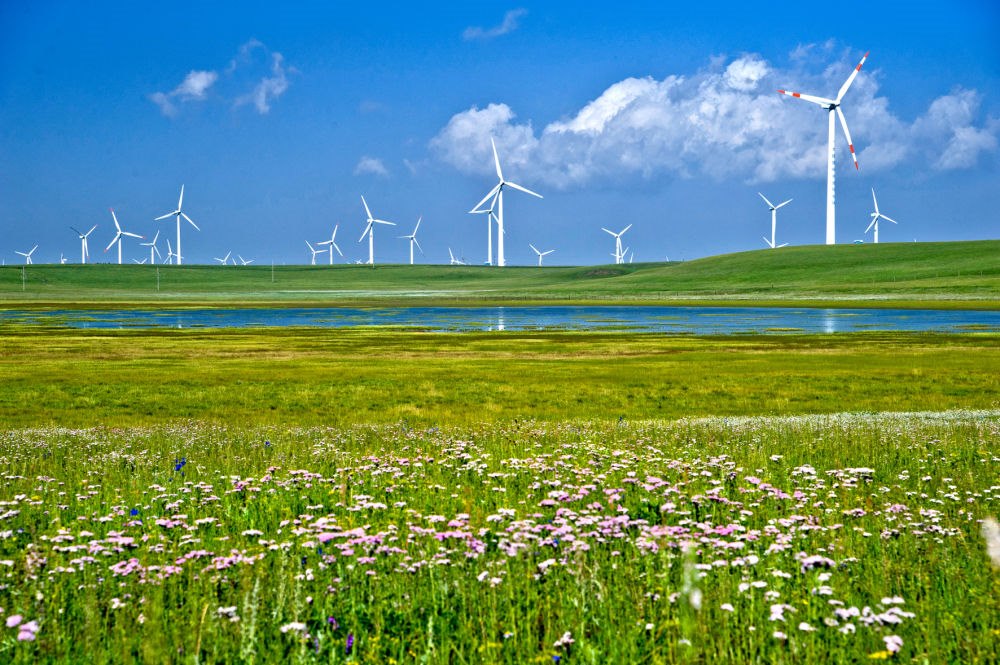 “輝騰錫勒”蒙古語意為“清涼的山崗”,因風(fēng)力資源豐富而得名,是建設(shè)風(fēng)電場理想的場所。如今,一排排風(fēng)電機猶如“白色森林”,碩大的風(fēng)翼就像一架架“大風(fēng)車”,在草原勁風(fēng)吹動下緩緩轉(zhuǎn)動,形成另一大景觀。