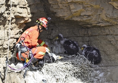 當(dāng)天7時(shí)左右,在烏海市海勃灣區(qū)甘德爾山景區(qū)半山腰處,攝影愛好者焦長青在拍攝時(shí)發(fā)現(xiàn)了一窩出生20多天的幼年野生黑鸛,其中一只黑鸛行動異常,疑似受傷。他立即撥打了119報(bào)警電話,同時(shí)聯(lián)系了烏海市野生動物保護(hù)部門。9時(shí)許,烏海市消防支援支隊(duì)光明路特勤站和烏海市野生動物保護(hù)部門的工作人員到達(dá)現(xiàn)場。經(jīng)勘查,在距離懸崖正下方大約30米處的巖洞內(nèi),一只幼年黑鸛被尼龍繩纏繞住腿部而受傷,不能行動。消防員隨后尋找合適的位置制作錨點(diǎn)。消防員陳意攜帶救援裝備速降到懸崖下方展開營救,一個(gè)小時(shí)之后,受傷的幼年黑鸛被成功救出,并送往海勃灣區(qū)林業(yè)草原局救助站進(jìn)行救治。