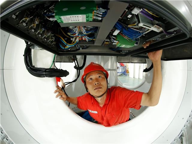 金風(fēng)科技公司工人在安裝風(fēng)機主機。金泉攝