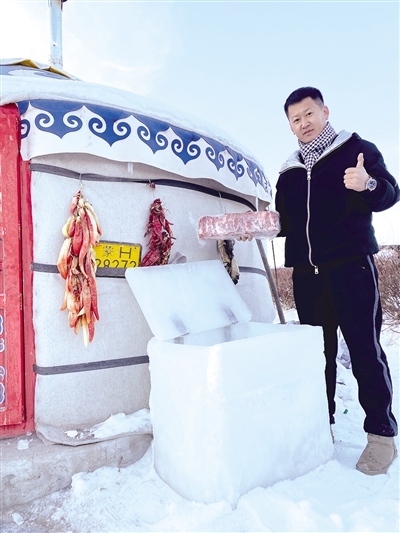 12月8日,記者幾經(jīng)周折與視頻中的小伙張智磊取得了聯(lián)系。張智磊今年36歲,從小在錫林郭勒大草原長(zhǎng)大,在當(dāng)?shù)刂饕雠Q蛉馍?。?duì)于意外走紅,張智磊直言自己也沒(méi)有想到?!耙曨l是在錫林浩特市南郊向陽(yáng)村叔叔家院子里的蒙古包拍攝的。記得小時(shí)候,每到冬天,周邊牧民都是把食物埋在雪地里儲(chǔ)存。我前幾天也拍了一個(gè)從雪地里找羊腿的視頻,有粉絲留言‘放在雪地里會(huì)不會(huì)忘記位置容易丟了’,然后我就突發(fā)奇想,干脆做個(gè)‘冰箱’把年貨放進(jìn)去。”張智磊告訴記者,他從12月3日開(kāi)始凍冰塊,12月4日把凍結(jié)實(shí)的冰塊拿出來(lái)用冷水黏合,因?yàn)楸鶋K低于0攝氏度,遇水就會(huì)瞬間黏在一起,然后開(kāi)始著手打磨,棱棱角角都用電熨斗熨平整,再加上蓋,一個(gè)“冰箱”就完成了。
