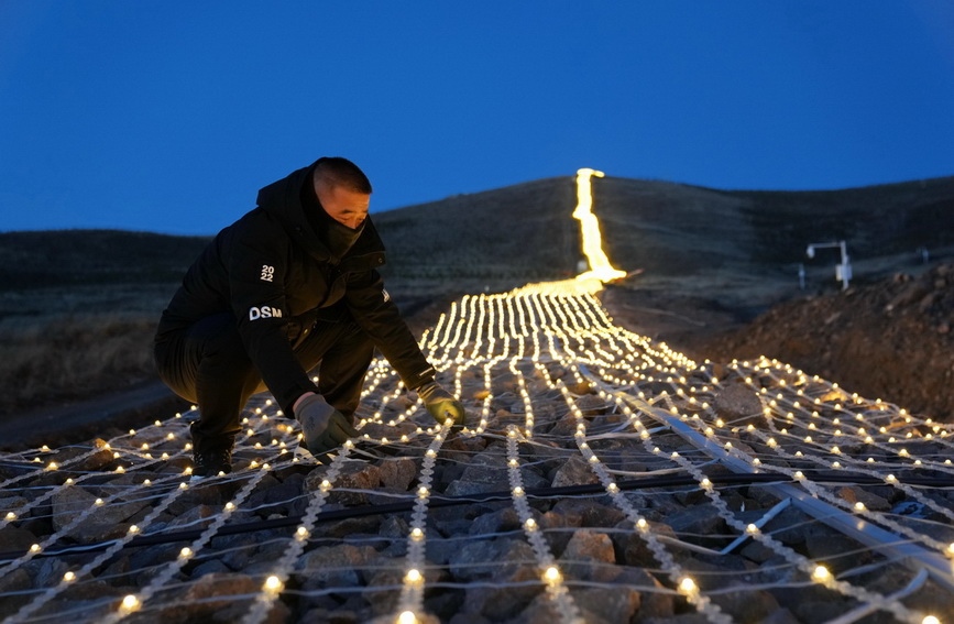 凜冬時(shí)節(jié),在桑寶拉格蘇木吉日嘎郎圖嘎查沙地綜合治理項(xiàng)目區(qū)的施工現(xiàn)場,防風(fēng)固沙及生態(tài)修復(fù)施工依舊火熱。十幾名當(dāng)?shù)啬撩裾诩泳o安裝網(wǎng)圍欄,對固定沙化區(qū)域采取自然休養(yǎng)措施,幫助草原逐步恢復(fù)生態(tài)。