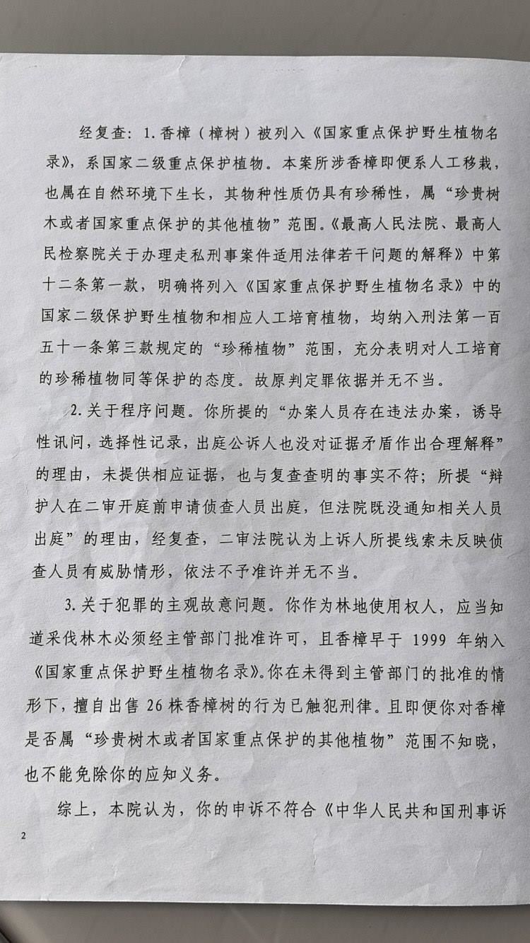 上游新聞記者注意到,敘永縣法院一審判決中還引用了最高法、最高檢《關(guān)于辦理走私刑事案件適用法律若干問題的解釋》,以“國家禁止、限制出口的珍稀植物,包括相關(guān)名錄中人工培育的植物”為由,認(rèn)定了人工栽植的國家重點(diǎn)保護(hù)物種也應(yīng)予以保護(hù)的結(jié)論。敘永縣法院綜合認(rèn)定,馬萬林等砍伐、售賣的香樟樹屬于國家重點(diǎn)保護(hù)植物,對辯方提出的“香樟樹不屬于重點(diǎn)保護(hù)野生植物”的辯護(hù)理由不予采納,但在量刑時(shí)予以考慮,酌情減輕了對兩名被告人的處罰。