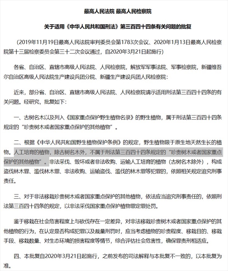 2020年3月,兩高批復(fù)明確“人工培育的植物,除古樹名木外,不屬于刑法第三百四十四條規(guī)定的‘珍貴樹木或者國家重點(diǎn)保護(hù)的其他植物’”。圖片來源/網(wǎng)頁截屏