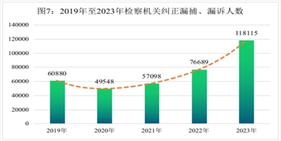全國檢察機(jī)關(guān)共糾正公安機(jī)關(guān)遺漏提請逮捕的犯罪嫌疑人19485人,同比上升12.8%;糾正遺漏起訴同案犯98630人,同比上升66%,追捕、追訴力度不斷加大。糾正漏捕判處三年有期徒刑以上刑罰8781人,糾正漏訴判處有期徒刑以上刑罰78137人,共計(jì)86918人,糾正漏捕、漏訴判處有期徒刑以上刑罰率96.5%,同比增加11.1個百分點(diǎn),質(zhì)量總體較高。