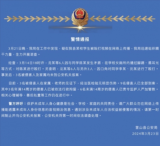 央視網(wǎng)消息:3月23日,營(yíng)山縣公安局發(fā)布警情通報(bào),3月21日晚,該局在工作中發(fā)現(xiàn),疑似營(yíng)山縣某校學(xué)生被毆打視頻在網(wǎng)絡(luò)上傳播,迅速組織精干力量,全力開(kāi)展調(diào)查。