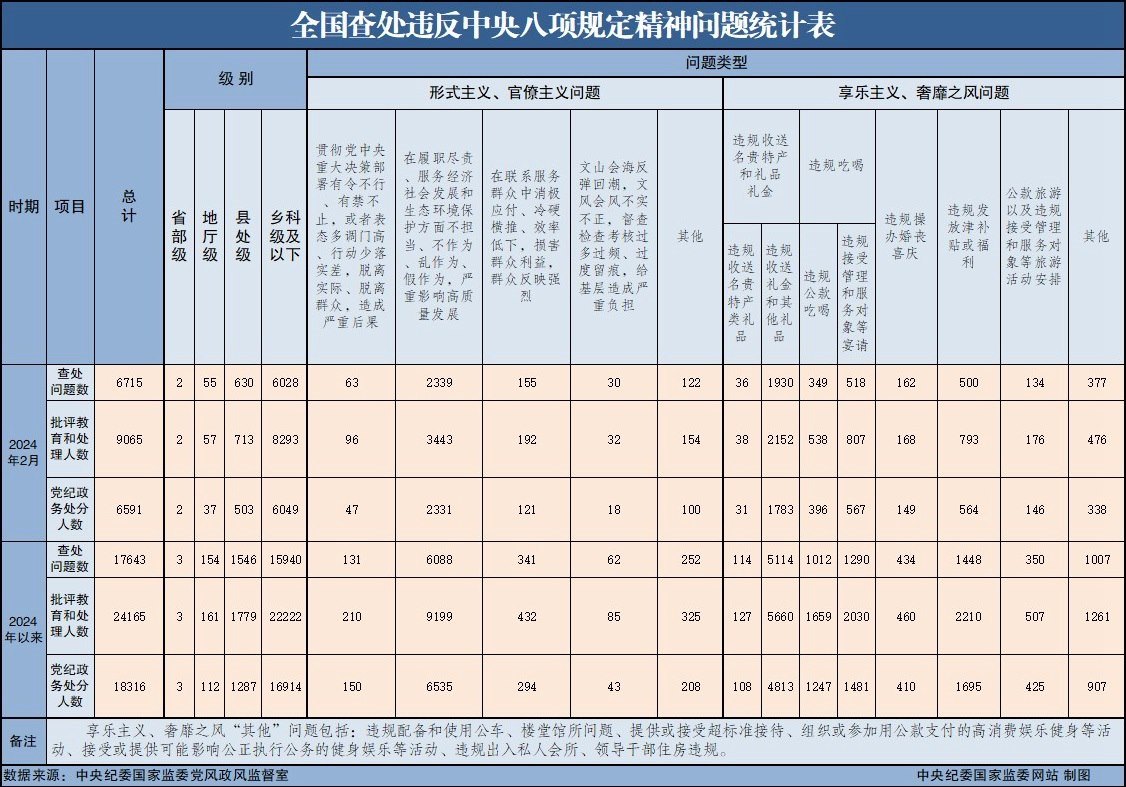央視網(wǎng)消息:3月26日,中央紀(jì)委國家監(jiān)委公布了2024年2月全國查處違反中央八項(xiàng)規(guī)定精神問題匯總情況。當(dāng)月,全國共查處違反中央八項(xiàng)規(guī)定精神問題6715起,批評教育和處理9065人,其中黨紀(jì)政務(wù)處分6591人,這是連續(xù)第126個(gè)月公布月報(bào)數(shù)據(jù)。