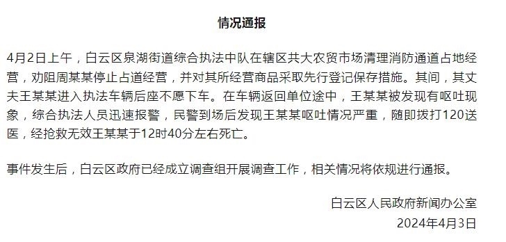 央視網(wǎng)消息:據(jù)貴陽網(wǎng)官微消息,4月3日,貴陽市白云區(qū)人民政府新聞辦公室通報(bào),4月2日上午,白云區(qū)泉湖街道綜合執(zhí)法中隊(duì)在轄區(qū)共大農(nóng)貿(mào)市場(chǎng)清理消防通道占地經(jīng)營(yíng),勸阻周某某停止占道經(jīng)營(yíng),并對(duì)其所經(jīng)營(yíng)商品采取先行登記保存措施。其間,其丈夫王某某進(jìn)入執(zhí)法車輛后座不愿下車。在車輛返回單位途中,王某某被發(fā)現(xiàn)有嘔吐現(xiàn)象,綜合執(zhí)法人員迅速報(bào)警,民警到場(chǎng)后發(fā)現(xiàn)王某某嘔吐情況嚴(yán)重,隨即撥打120送醫(yī),經(jīng)搶救無效王某某于12時(shí)40分左右死亡。