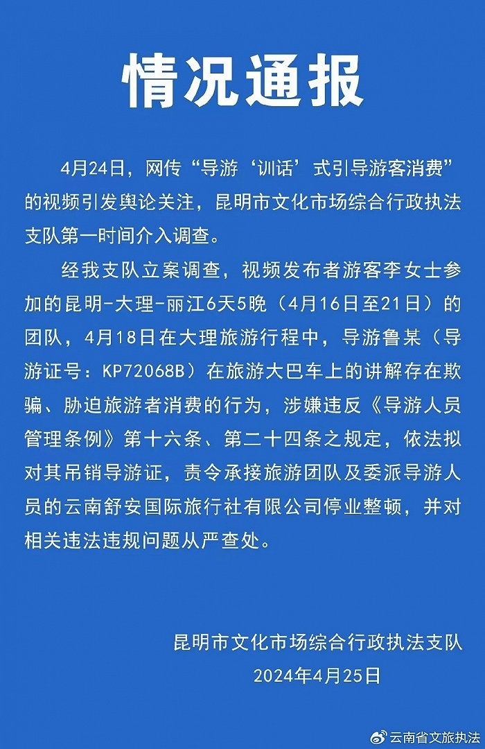 央視網消息:4月25日,昆明市文化市場綜合行政執(zhí)法支隊通報,4月24日,網傳“導游‘訓話’式引導游客消費”的視頻引發(fā)輿論關注,昆明市文化市場綜合行政執(zhí)法支隊第一時間介入調查。經支隊立案調查,視頻發(fā)布者游客李女士參加的昆明-大理-麗江6天5晚(4月16日至21日)的團隊,4月18日在大理旅游行程中,導游魯某在旅游大巴車上的講解存在欺騙、脅迫旅游者消費的行為,涉嫌違反《導游人員管理條例》第十六條、第二十四條之規(guī)定,依法擬對其吊銷導游證,責令承接旅游團隊及委派導游人員的云南舒安國際旅行社有限公司停業(yè)整頓,并對相關違法違規(guī)問題從嚴查處。