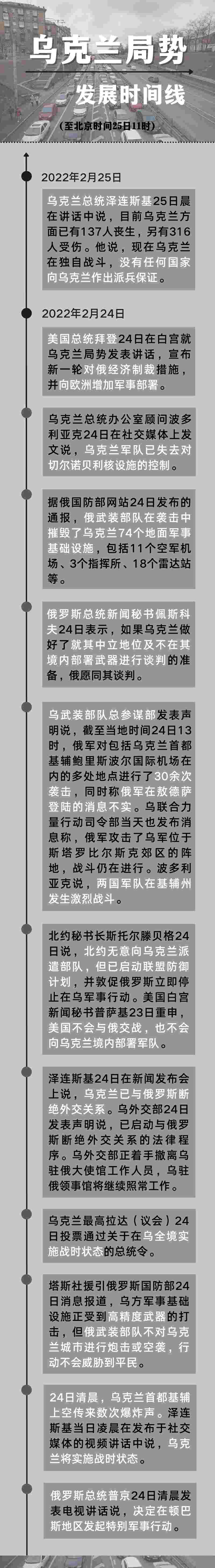 新華社北京2月25日電 自俄羅斯軍隊(duì)24日晨在頓巴斯地區(qū)發(fā)起特別軍事行動(dòng)以來(lái),俄軍對(duì)多處地點(diǎn)進(jìn)行了襲擊。俄方表示,如烏克蘭做好就其中立地位及不在其境內(nèi)部署武器進(jìn)行談判的準(zhǔn)備,俄愿同其談判。以下為截至目前的重要節(jié)點(diǎn)時(shí)間線: