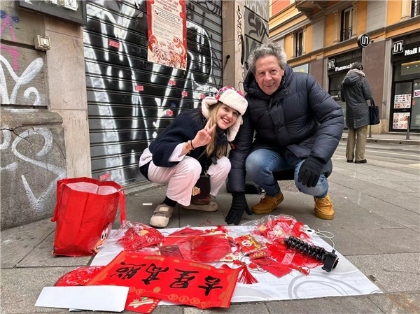 瑞麗和父親“老富”在米蘭街頭賣(mài)春聯(lián)。受訪者供圖
