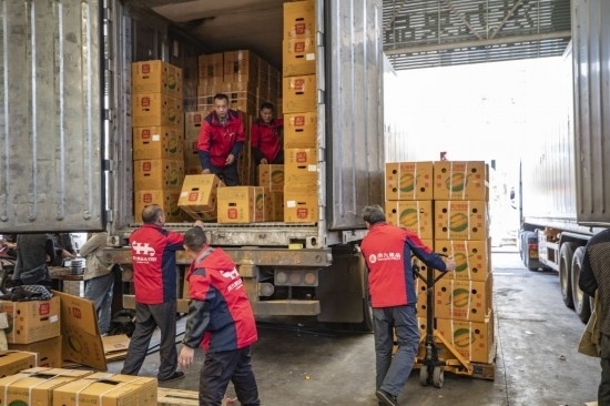 在重慶市江津區(qū)雙福農(nóng)貿(mào)城,洪九果品的工作人員在搬運從泰國運輸過來的榴蓮(2022年4月19日攝)。新華社記者 黃偉 攝
