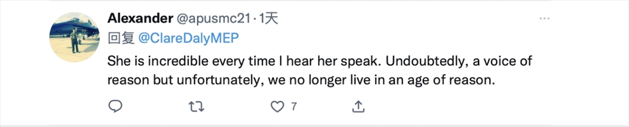 此前,克萊爾·戴利在接受環(huán)球時報記者采訪時,當被問及在歐洲議會中是否會因為自身的對華立場而受到壓力,戴利稱,那或許不是一種“壓力”,而是一種反華的種族主義和陳舊的觀念作祟。愛爾蘭的媒體把我和我的同事米克·華萊士妖魔化了,因為我們發(fā)表的一些評論被中國媒體報道,他們就給我們貼上“專制政權(quán)傀儡”的標簽。這種無知不能改變什么,所以我覺得不用擔心。我們的工作是利用歐洲議會這個平臺來代表歐洲公民的利益,而與中國保持良好關(guān)系符合歐洲公民的利益。