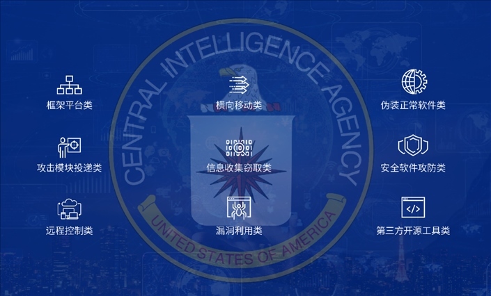 國(guó)家病毒應(yīng)急處理中心和360公司通過進(jìn)一步技術(shù)分析發(fā)現(xiàn),盡管CIA的后門程序和攻擊組件大都以無(wú)實(shí)體文件的內(nèi)存駐留執(zhí)行的方式運(yùn)行,這使得對(duì)相關(guān)樣本的發(fā)現(xiàn)和取證難度極大。即使這樣,聯(lián)合技術(shù)團(tuán)隊(duì)還是成功找到了解決取證難題的有效方法,發(fā)現(xiàn)了CIA所使用的9個(gè)類別的攻擊武器,包括攻擊模塊投遞類、遠(yuǎn)程控制類、信息收集竊取類、第三方開源工具類等。