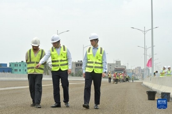 5月3日,姚堯(右)在孟加拉國達(dá)卡機(jī)場高架快速路項目上工作。新華社發(fā)