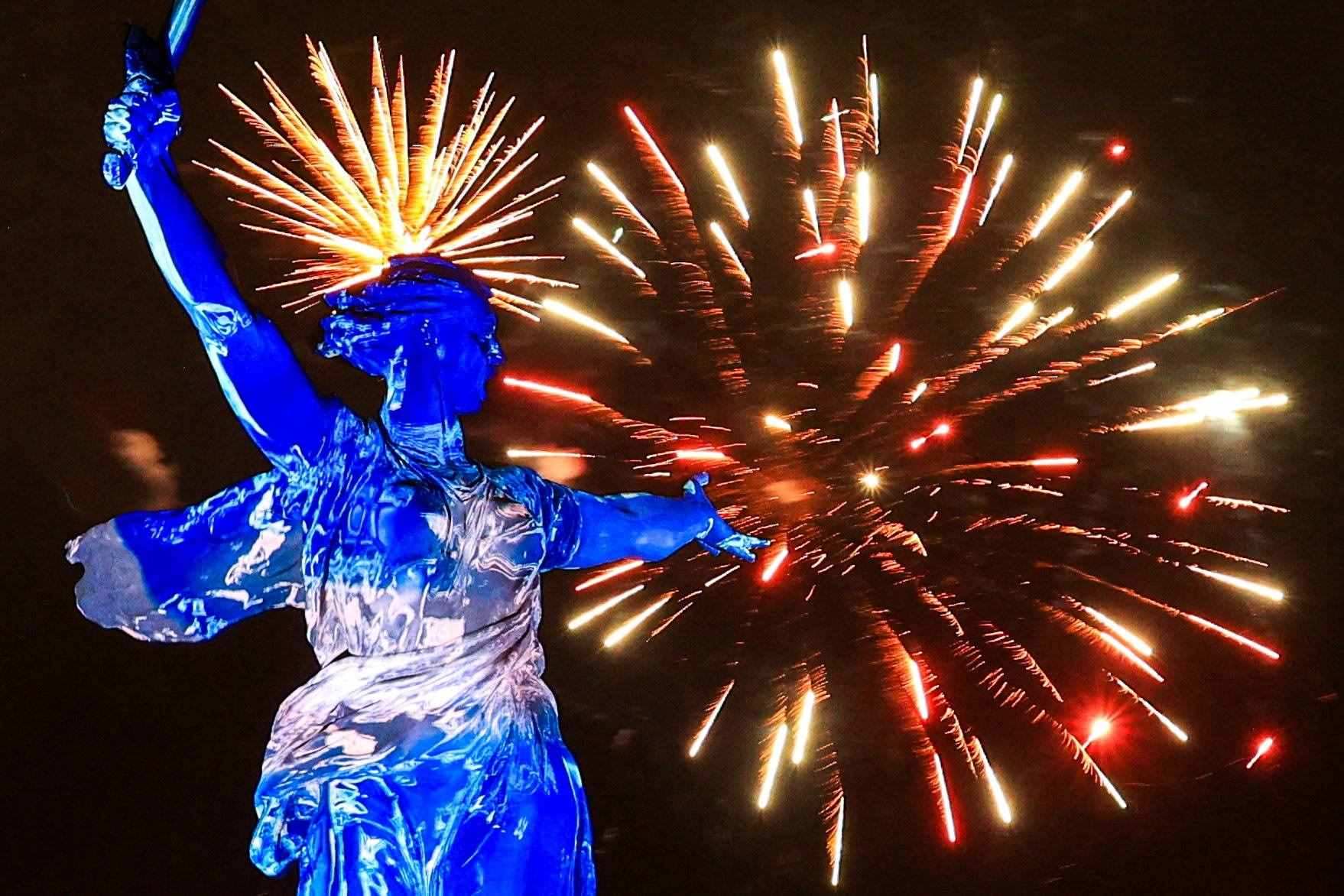 當(dāng)?shù)貢r(shí)間2023年5月9日,俄羅斯伏爾加格勒,紀(jì)念衛(wèi)國戰(zhàn)爭勝利78周年,煙花在馬馬耶夫山崗的祖國召喚雕像上綻放。