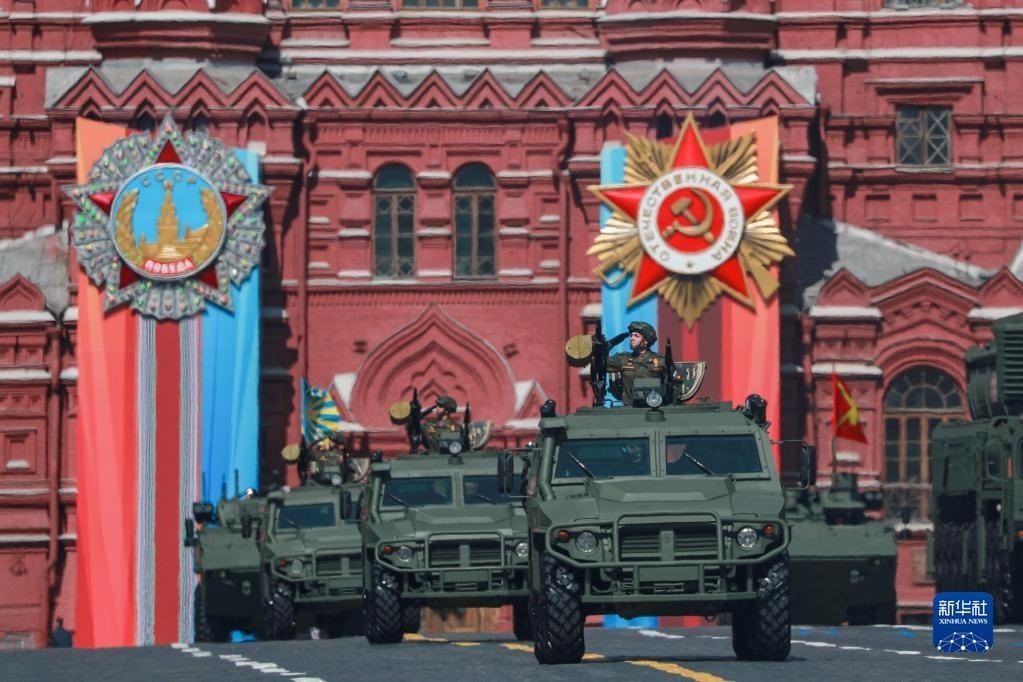 5月9日,在俄羅斯首都莫斯科,軍車編隊(duì)駛過紅場(chǎng)。