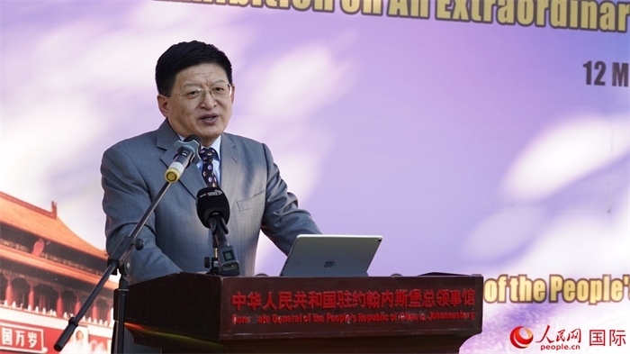 5月12日,中國駐約翰內(nèi)斯堡總領館在館內(nèi)舉辦新時代中國非凡十年成就圖片展,慶祝中南建交25周年。人民網(wǎng) 劉暢攝