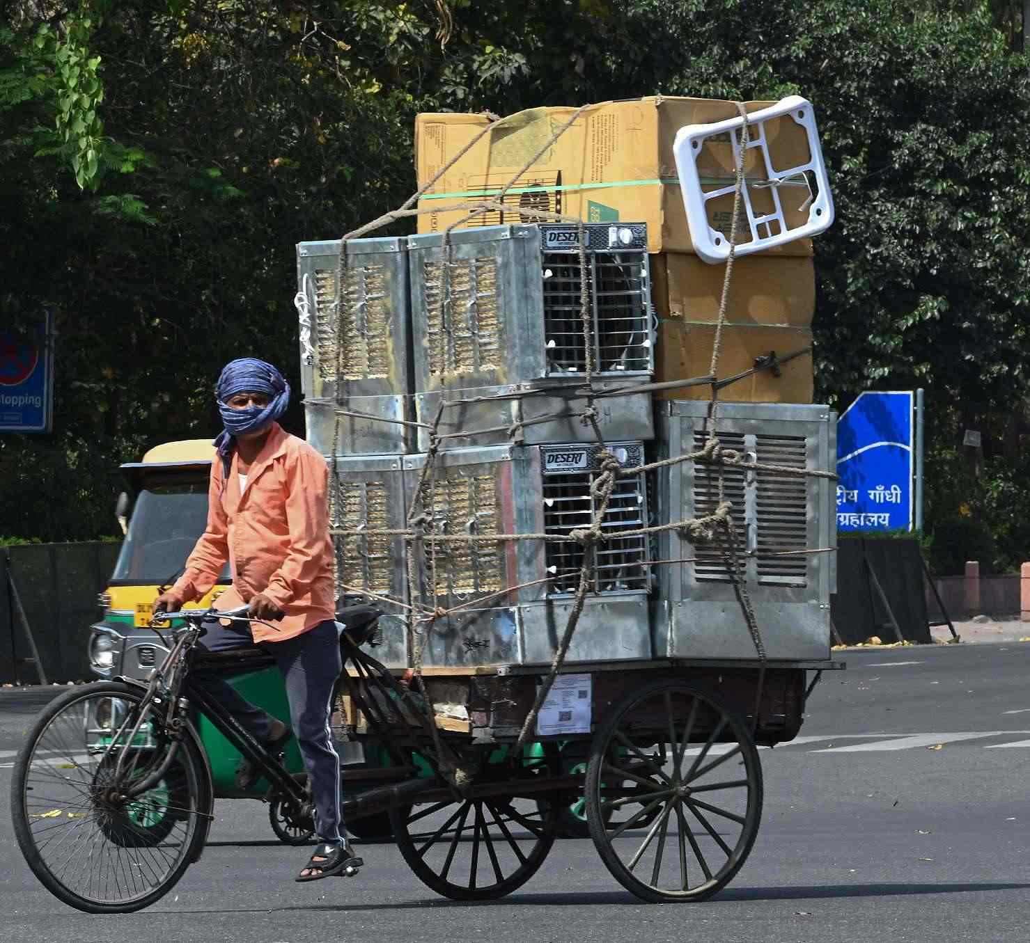 當(dāng)?shù)貢r間2023年4月16日,印度新德里,氣溫飆升至40℃以上,工人運(yùn)送冷氣機(jī)。