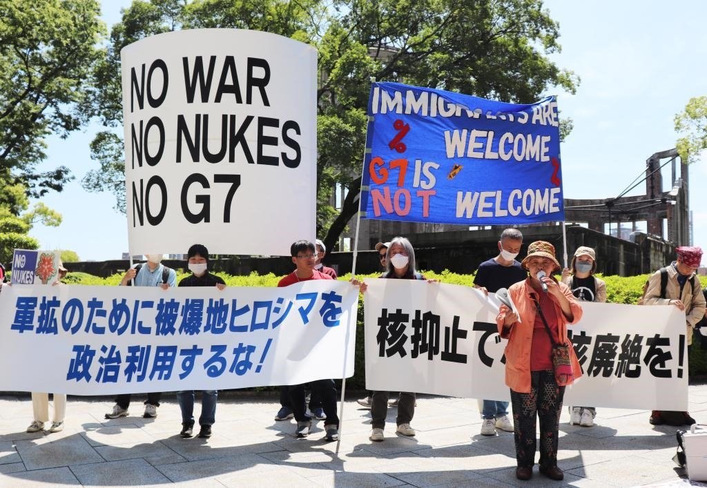 14日,一場更大的抗議活動在廣島和平紀(jì)念公園原子彈爆炸遺址前舉行,民眾手舉各式標(biāo)語,高呼“不要G7”“不做戰(zhàn)爭幫兇”等口號,希望喚起政府對戰(zhàn)爭的反思。