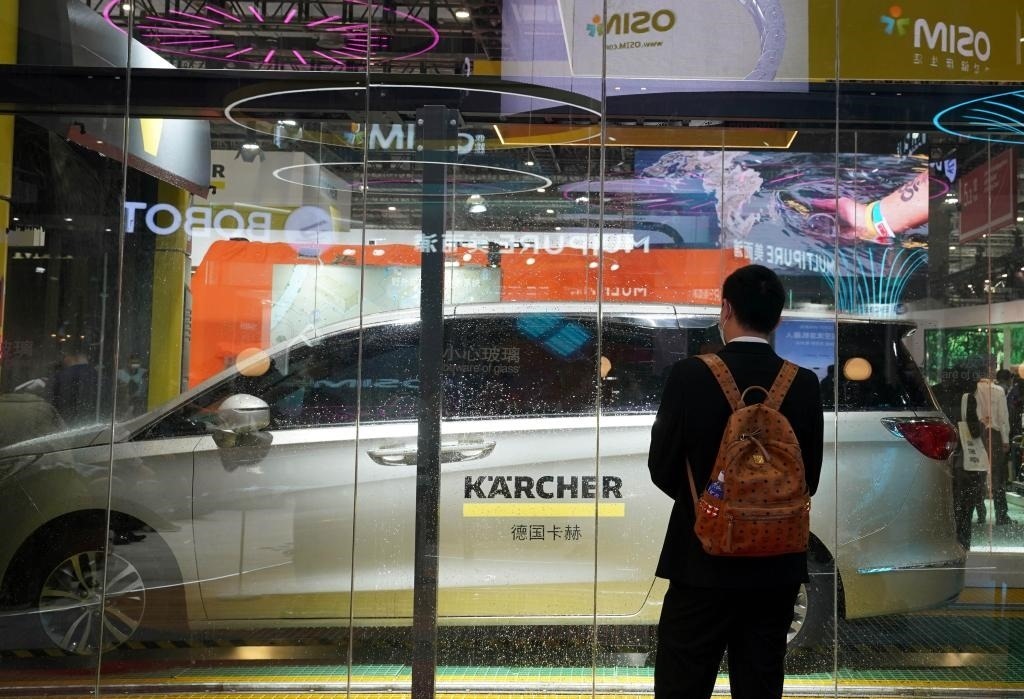 2021年11月6日,觀眾在第四屆進(jìn)博會(huì)德國(guó)卡赫展臺(tái)參觀全自動(dòng)洗車(chē)機(jī)器人的演示。(新華社記者劉穎攝)