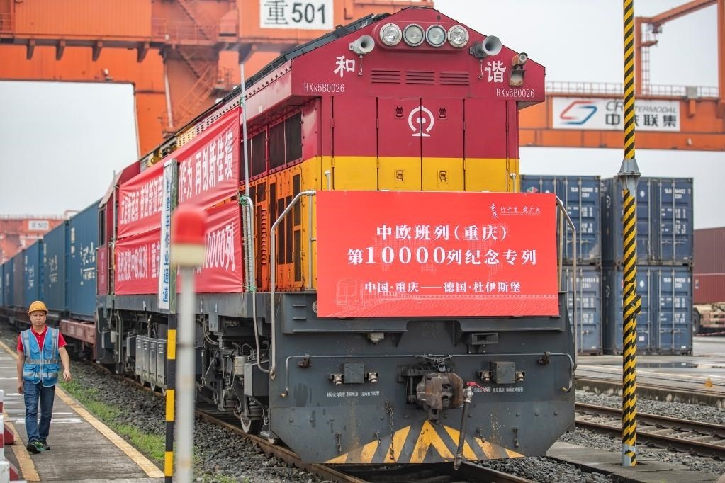 2022年6月23日,在重慶團(tuán)結(jié)村中心站,鐵路工作人員從中歐班列(重慶)第10000列列車(chē)旁走過(guò)。當(dāng)日,第10000列中歐班列(重慶)從重慶團(tuán)結(jié)村中心站順利駛出,奔赴德國(guó)杜伊斯堡。(新華社記者黃偉攝)