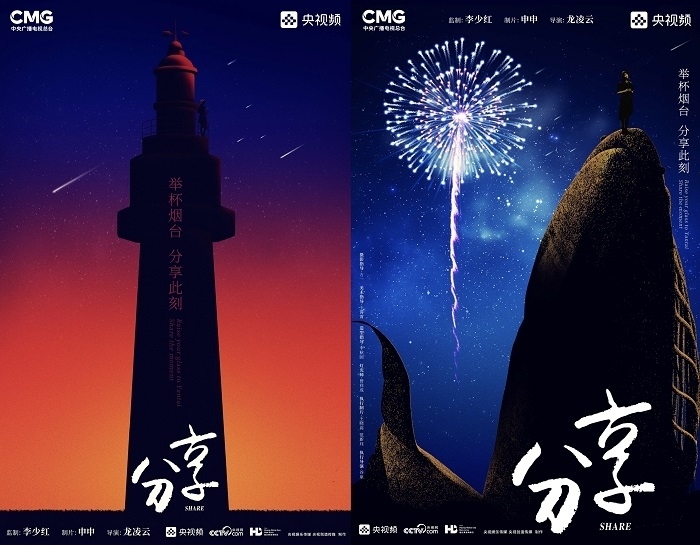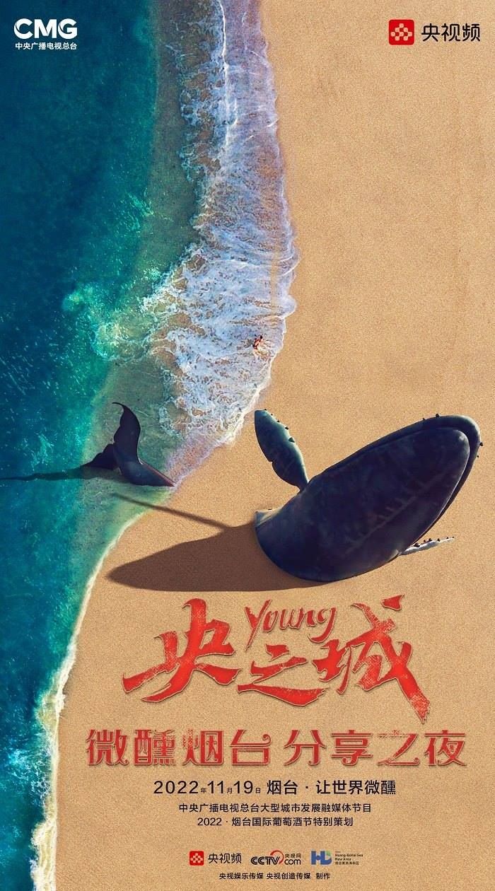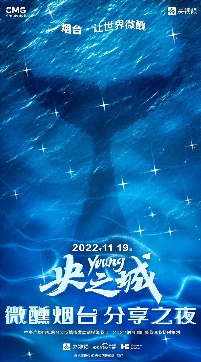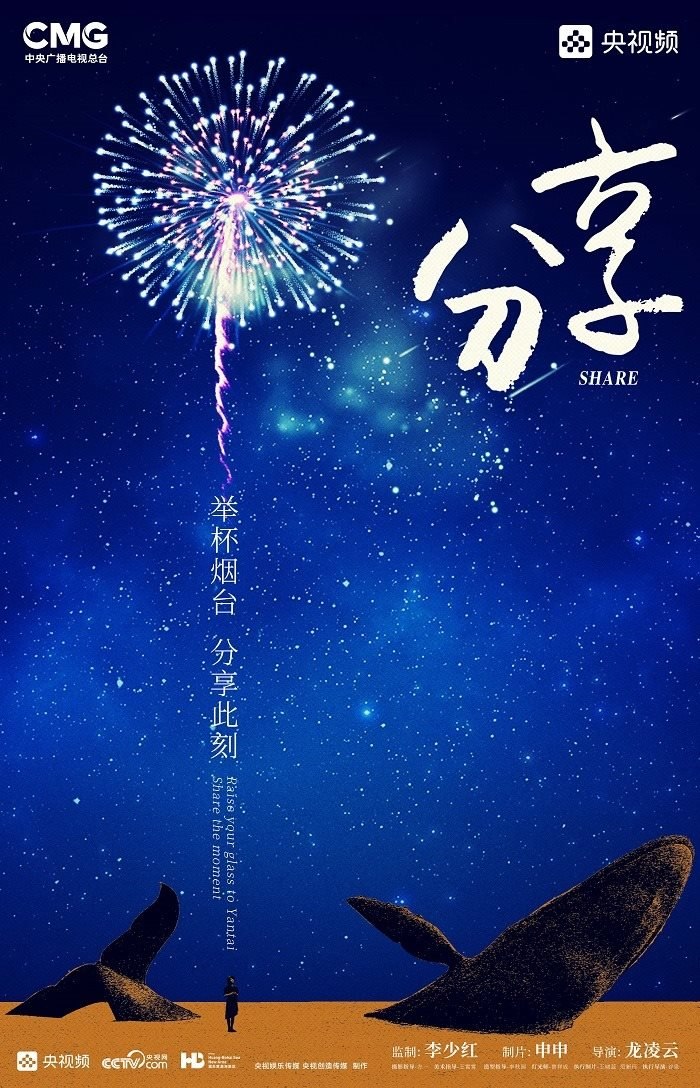 田雨峰在拍攝短片海報(bào)用圖的時(shí)候,首先確定了畫面中最突出的形象元素,同時(shí)也是交代短片故事發(fā)生地的地標(biāo)性雕塑——“孤獨(dú)的鯨“。這個(gè)雕塑如今是煙臺(tái)開發(fā)區(qū)金沙灘的網(wǎng)紅打卡地,網(wǎng)友為其起名”鯨落“。碩大的鯨魚從淺海處躍出海面,魚頭和魚尾凌空飛躍,其身體的一部分似藏在沙灘里。這是一個(gè)在真實(shí)生活中不會(huì)出現(xiàn)的景象,充滿了動(dòng)畫般的奇幻想象,位于煙臺(tái)碧藍(lán)的海邊,又天然地帶上了一點(diǎn)浪漫的色彩。短片中”舉杯煙臺(tái),分享此刻“的Slogan綴在尾聲,分享的正是煙臺(tái)這座城市獨(dú)有的沙灘、夜空、煙火和人間。短片中可以娓娓道來(lái)般逐漸交代,但在海報(bào)里,二環(huán)用畫面底部金色沙灘上”孤獨(dú)的鯨“,畫面上方如大海般湛藍(lán)的星空,星空中綻放的煙花,鎖定了地球上唯一的煙臺(tái)。田雨峰鏡頭中短片主角的人物照被二環(huán)拼貼到童話般色彩斑斕的畫面里,被著意縮小了的黑色小女孩于是成為一切奇幻、浪漫想象的迸發(fā)之源,和世界分享一個(gè)妙趣橫生的想法。