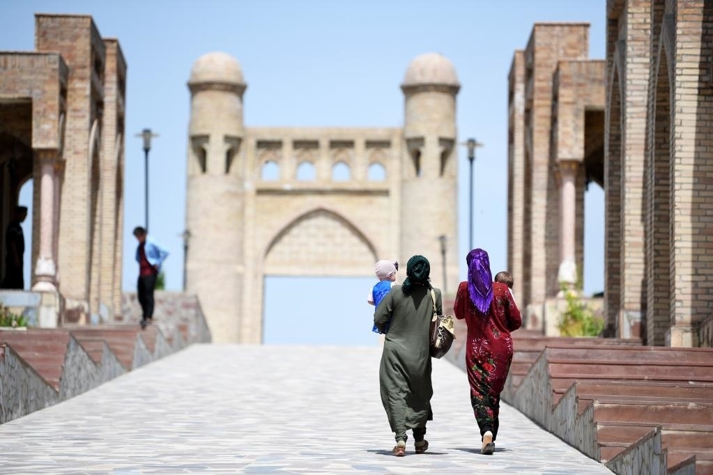 2022年9月3日,人們?cè)跒跗潉e克斯坦撒馬爾罕市列吉斯坦廣場(chǎng)游覽。新華社發(fā)