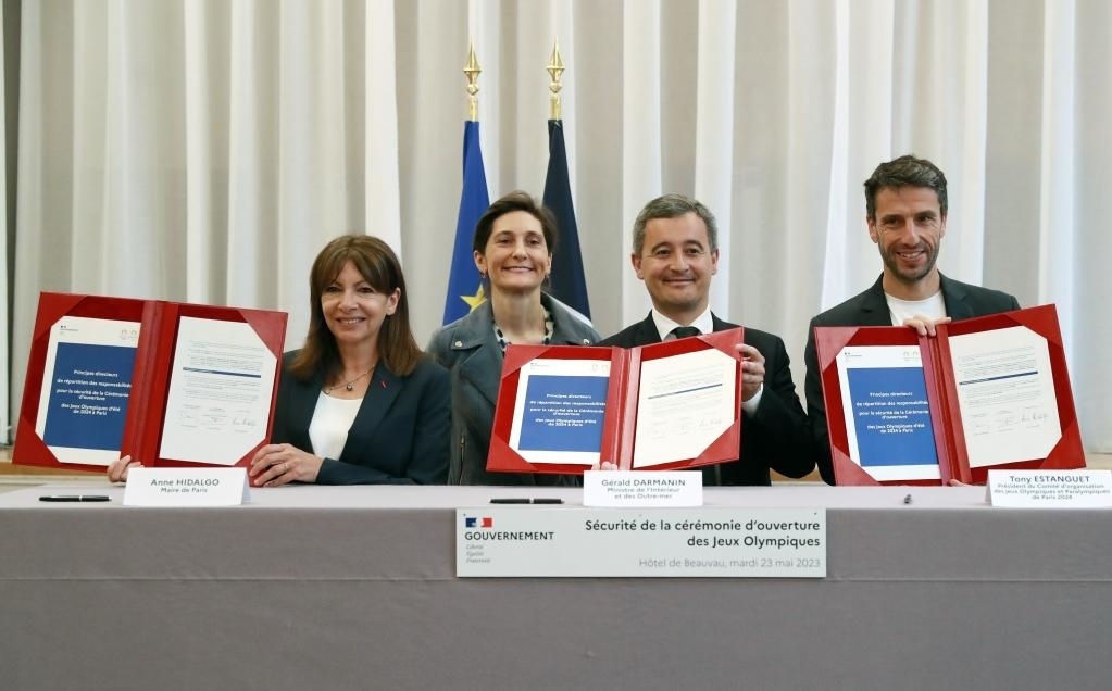 5月23日,為確保巴黎奧運會“河上”開幕式安全順利舉行,法國內(nèi)政部、巴黎奧組委、巴黎市政府三方在巴黎簽訂協(xié)議,明確各自的安保職責。新華社記者 高靜 攝