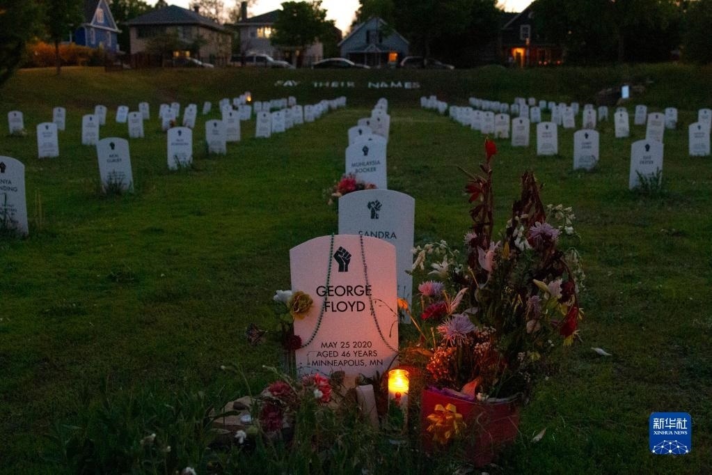 這是5月25日在美國明尼蘇達(dá)州明尼阿波利斯市拍攝的弗洛伊德墓碑前擺放的鮮花。新華社發(fā)(比利·布里格斯攝)