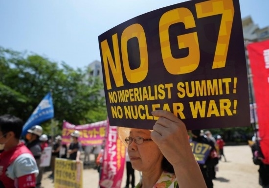 5月21日,民眾聚集在日本廣島袋町公園,抗議七國集團(tuán)峰會(huì)。新華社記者張笑宇攝