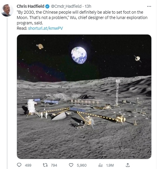 據(jù)報道,加拿大航天局前宇航員克里斯·哈德菲爾德在社交媒體推特上轉發(fā)了CGTN的一篇報道,他同時寫道,“中國探月工程總設計師吳偉仁說,‘到2030年,中國人的足跡一定能夠踏上月球。這不是個問題。’”