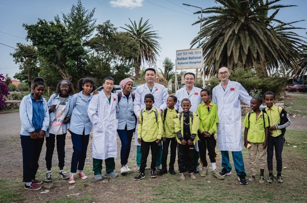 5月9日,在厄立特里亞首都阿斯馬拉的哈利貝特醫(yī)院門口,中國醫(yī)療隊隊員與附近學(xué)校兒童合影。新華社記者王冠森攝