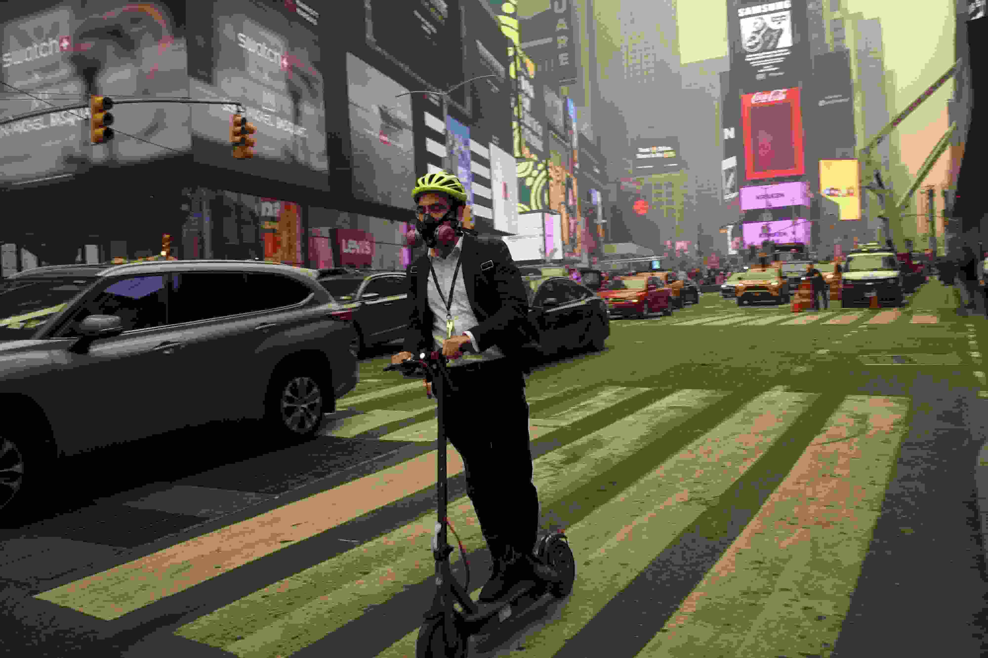當(dāng)?shù)貢r間6月7日,美國紐約時報廣場的一位騎行者佩戴著呼吸過濾器。近日,加拿大野火產(chǎn)生的煙霧蔓延至美國,紐約市出現(xiàn)霧霾,戶外民眾嚴(yán)密防護(hù)。 視覺中國
