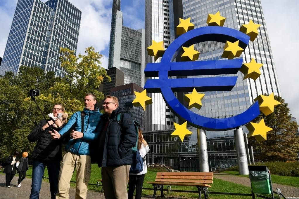 2021年10月13日,人們?cè)诘聡?guó)法蘭克福歐元雕塑前自拍留影。新華社記者 逯陽 攝