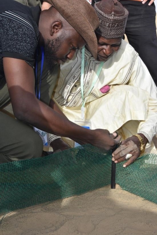 這位卡諾州環(huán)境部生態(tài)和林業(yè)主管按照中國專家的講授和示范,把條狀的可降解乳酸纖維沙袋灌滿沙子,擺成方格形狀,又拿起沉甸甸的鐵錘,把小樁子敲進沙地里,圍上高密度固沙網(wǎng)。