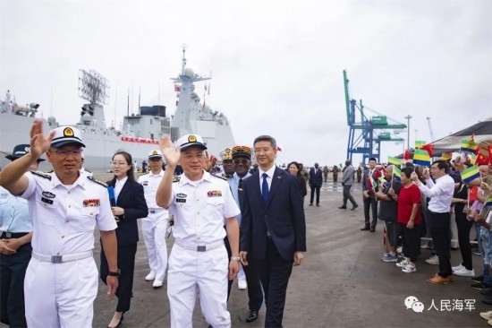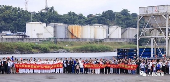 當日上午9時,懸掛著中加兩國國旗的編隊艦艇緩緩靠泊奧文多港碼頭,中國駐加蓬大使李津津及使館工作人員、當?shù)刂匈Y機構(gòu)人員、華人華僑代表,加蓬國防部秘書長彭吉中將及官兵代表等300余人位碼頭迎接。