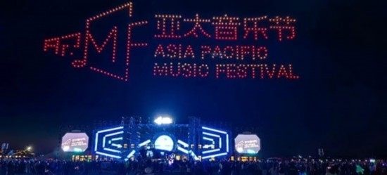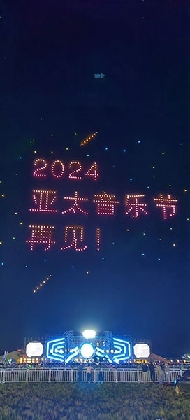 在氣氛最熱烈的時(shí)候,500架無人機(jī)緩緩升空,列隊(duì)表演,不斷變換陣型,時(shí)而在空中呈現(xiàn)出“亞太音樂節(jié)”、“中國外文局亞太傳播中心”、“太仆寺旗歡迎您”等巨幅字幕,時(shí)而呈現(xiàn)吉他、音符、蒙古包等色彩繽紛的圖案。