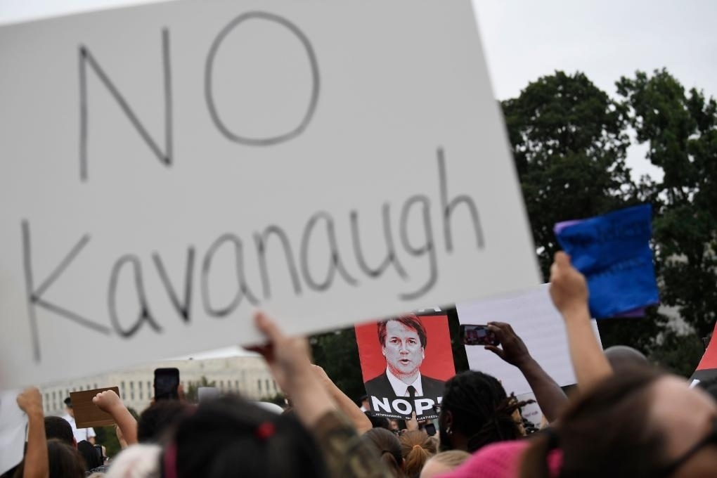 2018年10月6日,在美國首都華盛頓聯(lián)邦最高法院前,抗議者反對卡瓦諾出任聯(lián)邦最高法院大法官。新華社記者劉杰攝