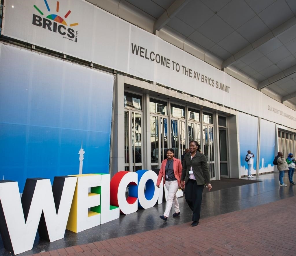 8月21日,在南非約翰內斯堡,行人走過金磚國家領導人第十五次會晤舉辦場所桑頓會展中心。新華社記者張譽東攝