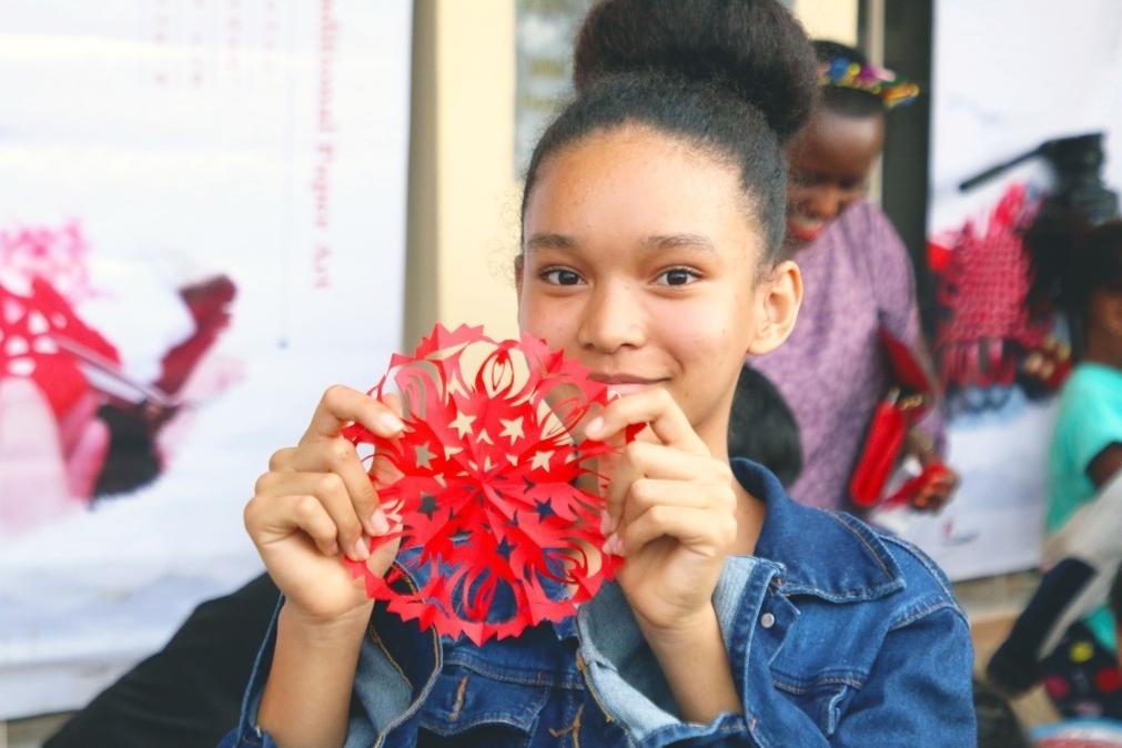 9月23日,盧旺達(dá)首都基加利,在盧旺達(dá)大學(xué)孔子學(xué)院舉辦的“中國(guó)文化進(jìn)校園”暨中秋國(guó)慶慶?;顒?dòng)現(xiàn)場(chǎng),一名女孩展示剪紙成果。(新華社發(fā),黃萬晴攝)