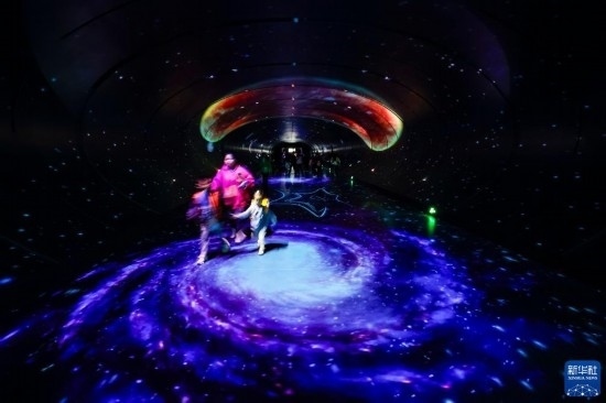 10月18日,在第81屆世界科幻大會主場館——成都科幻館內(nèi),人們走在“時空隧道”內(nèi)。
