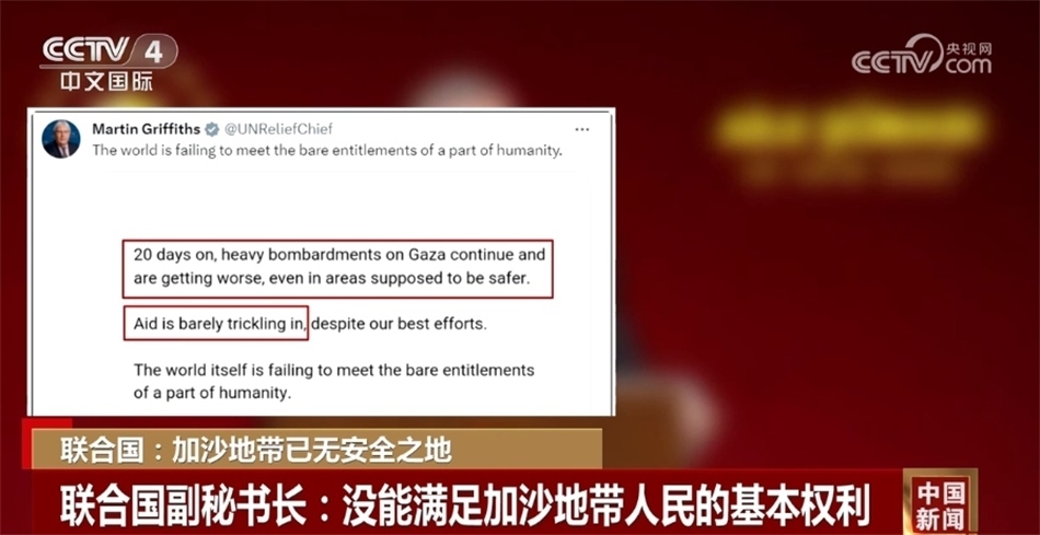 同一天,聯(lián)合國分管人道主義事務的副秘書長馬丁·格里菲斯在社交媒體發(fā)文稱,在過去20天里,對加沙地帶的猛烈轟炸愈發(fā)嚴重,一些本該安全的地區(qū)也已經(jīng)陷入危險,但援助物資卻很難進入加沙地帶,國際社會沒能滿足一部分人的基本權利。
