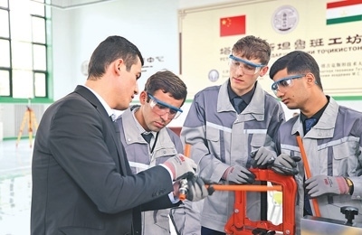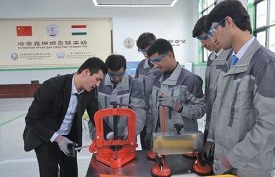 2022年,中亞地區(qū)首家魯班工坊在塔吉克斯坦啟動運營,為塔吉克斯坦開展職業(yè)培訓(xùn)作出了積極貢獻(xiàn)。圖為今年4月,在塔吉克斯坦魯班工坊,塔方教授向?qū)W生介紹中方捐贈的設(shè)備。