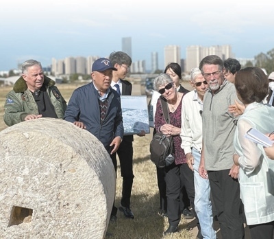 在云南昆明呈貢機場舊址,代表團一行聆聽講解員講述石碾背后的故事。呈貢機場曾是飛虎隊在昆明的主要基地之一,機場建設(shè)期間,當(dāng)?shù)厝嗣窭瓌泳薮笫肫秸艿?,付出艱苦努力。本報記者 劉玲玲攝