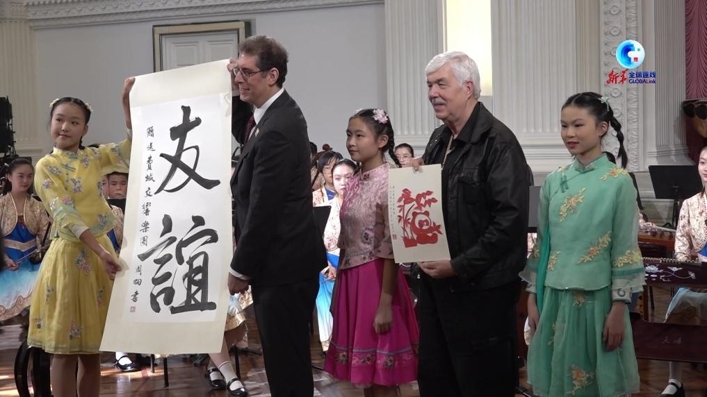 兩名少年兒童把在現(xiàn)場完成的寫有“友誼”二字的書法作品和以熊貓為主題的剪紙作品,作為禮品贈(zèng)送給費(fèi)城交響樂團(tuán)。