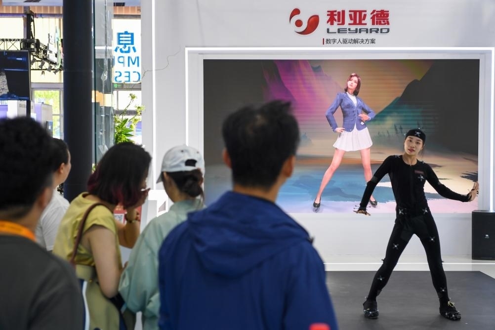 9月5日,在服貿(mào)會(huì)首鋼園區(qū)的電信、計(jì)算機(jī)和信息服務(wù)專題展內(nèi),參觀者觀看一家企業(yè)的數(shù)字人驅(qū)動(dòng)解決方案演示。新華社記者 鞠煥宗 攝